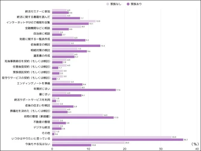 一方、家族がいる人では、「年賀状じまい」(17.6%)、「荷物の整理(断捨離)」(17.0%)が1,2位で、ここまではおひとりさまと傾向が近いものの、3位に「老後資金の検討」(13.3%)がランクインする結果となりました。