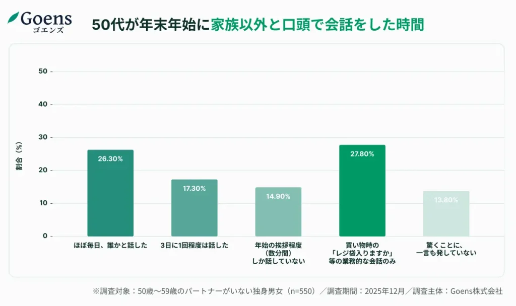 年末年始の会話量は「業務的な会話のみ(27.8%)」「一言も発していない(13.8%)」。41.6%の50代独身者が誰ともプライベートな会話をしておらず、社会的孤立のリスクが垣間見える結果となった。