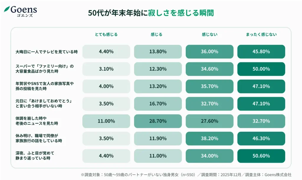 孤独を感じる瞬間ランキングでは、「あけましておめでとうと言い合う相手がいない時」「大晦日に一人でテレビを見ている時」などを抑え、「体調不良や老後のニュースを見た時」がトップに。情緒的な寂しさよりも、何かあった時に誰もいないという「孤立」への不安が浮き彫りに。